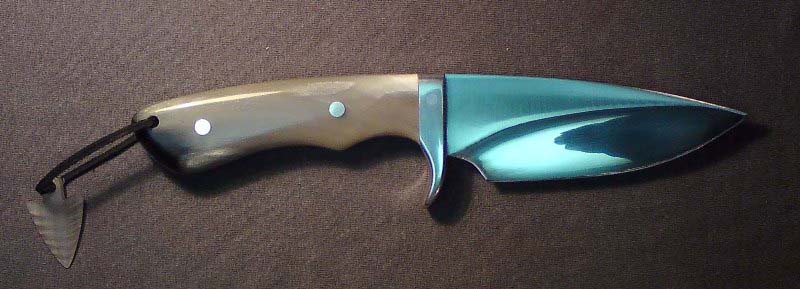 Rado - skinner ti je dobar - srpanj 2008 . Malo više poliranja na oštrici bi bilo dobro. Bronca je dosta nezahvalna radi patine posebice ako nož koristiš u lovu. Koristi inox - bilo koji. Predlažem ti da ime napišeš na mjesto gdje si napisao čelik a vrstu čelika na suprotnu stranu. Ovako uređeni i poslikani nož sa imenom ili žigom, mi stariji majstori nazivamo PREZENTACIJSKA STRANA. Jopan čestitam ponovo. Nož je lijep i dobro završen a ručka od roga je super. Na štitniku prsta :A28: vide ti se zakovice koje ubuduće moraju nestati radi više vrijednosti noža. Vrh noža-koliko vidim na slici-nije uopće oštar. Probaj s tom oštricom bez špice očistiti srnu, vidjet ćeš koliko ti fali. Nekakvo nepisano pravilo je barem 10 mm špice. Jetkaj ime ili svoj znak na lijevu stranu oštrice.