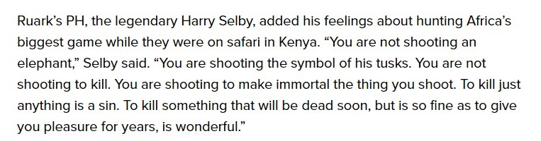 Dolje sam stavio screenshot, da ne prepisujem sve iz knjige The Horn of the hunter. Vjerojatno je najcitiranija lovacko putopisna knjiga u povijesti. Pisao je Robert Ruark, a vodic u lovu bio mu je Harry Selby, koji se sa pojavom ove Ruarkove knjige probio u jednog od najpoznatijih i najtrazenijih africkih profi lovaca.