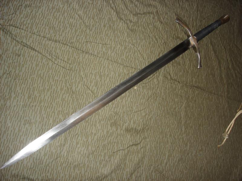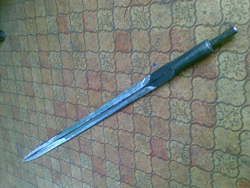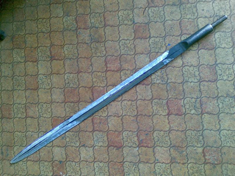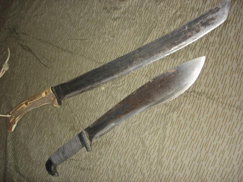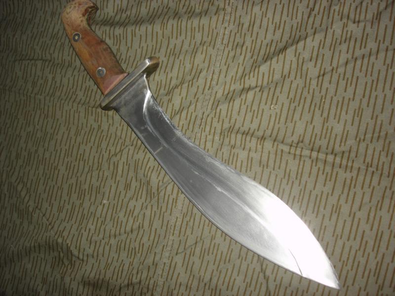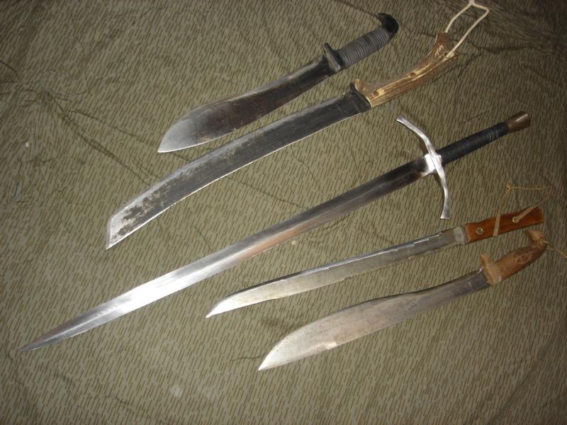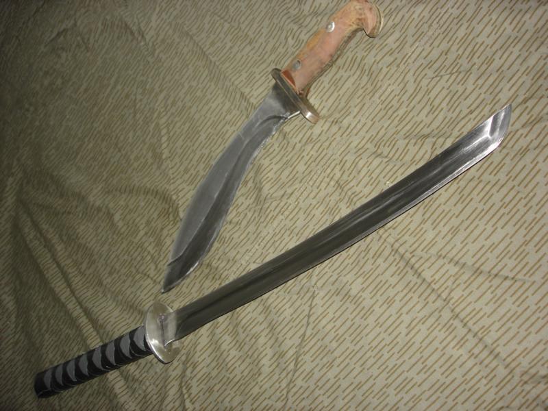 Nisam mogao odlučiti kamo da stavim post,evo ga ovdje,htio sam pokazati neke moje radove ali i reči nešto o materijalu i o obliku sječiva i drške.O čelicima se puno piše,o problemu nabave,obrade a ovi moji su možda nestandardni.Nemam mogučnost da bi kovao sječivo ili ga termički obradio,sve ovo je brušeno,80% je brušeno malom fleksom,osim mača tu sam potegao težu alatku fleksu fi230,koristio sam komade gatara sa pilane,vrhunski materijal,elastičan,drži oštricu,slabo hrđa ali samo od crne gatare,bijela je tek tako da se ima.Drška na kračoj omogučuje jake udarce a ne mora biti jak stisak zbog zadnjeg dijela a oblik sječiva po meni nenadmašan . Katana i moja verzija kukrija su od stare federplate,dobra oštrica,elastičana ali hrđaju,drška na "kukriju"je kao na mačeti. Rambo nož je izrađen osamdesetih od drške vilastog udarnog ključa 36,neuništiv je , drška je argonom i inkonelom navarena, šta je taj sve prošao mogu pisati cijeli dan.Nož za bacanje i mač su isti materijal,specijalni alat za pneumatski čekič,podnosi velika naprezanja,oštrica i drška mača su isto vareni inkonel žicom.Sve ove mačete i noževi su radni,stalno u akciji uz minimalno održavanje