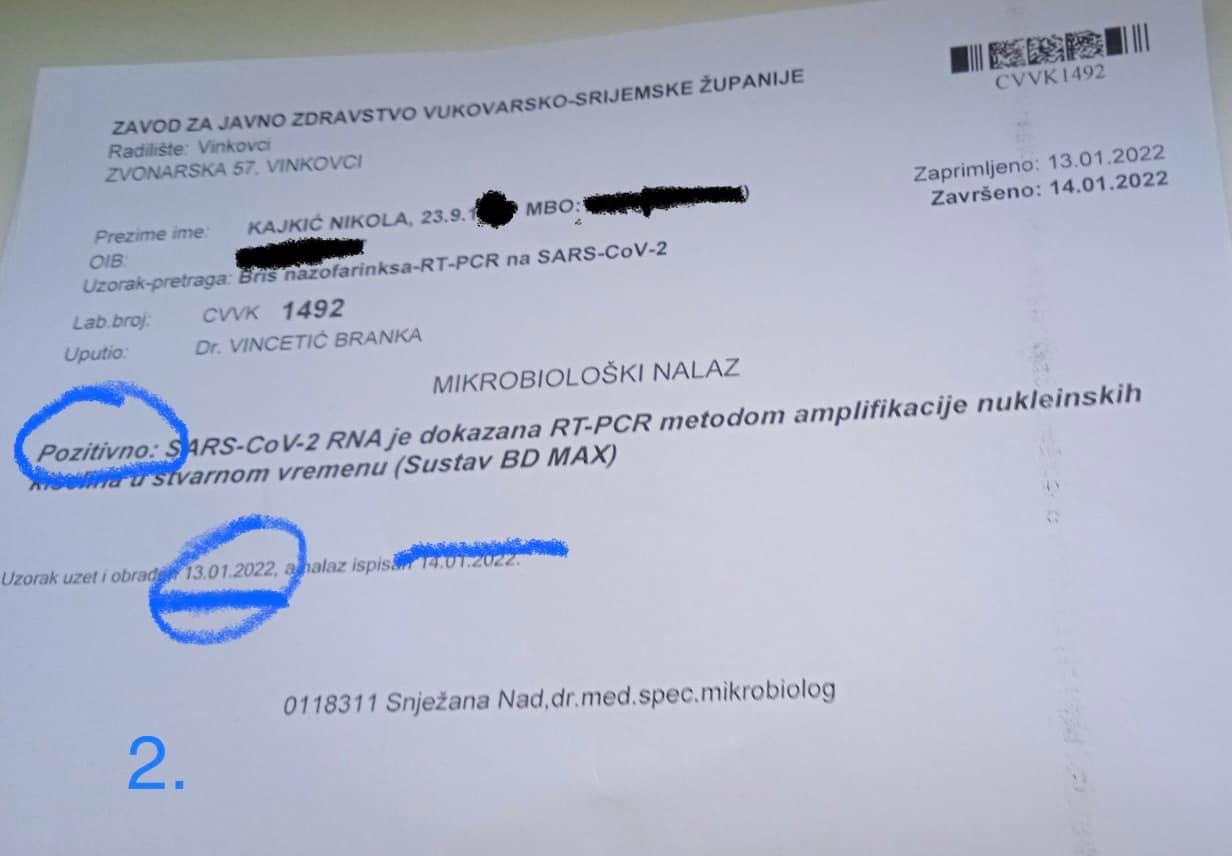 Dolaskom 13.01. 2022 u 08.00 satu na PCR testiranju, testiran sam na jednom punktu u OŽB Vinkovci mirkobiologija (po uputnici), NA KOJEM SAM BIO NEGATIVAN - foto 1, krenuvsi kuci nazvali su me i rekli mi da se moram doci i po uputnici testirati se i na drugom punktu u OŽB Vinkovci biokemija (ne znajuci da sam vec testiran na prvom punktu), dva PCR testiranja na dva različita punkta u razmaku od samo pola sata, NA OVOM DRUGOM PUNKTU SAM BIO POZITIVAN NA PCR testu na CORONU foto 2..