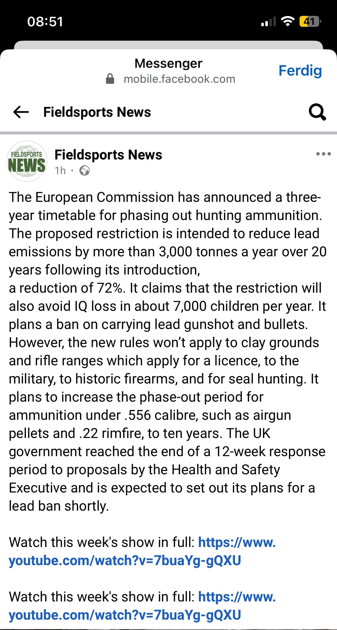 „Izvorni prijedlog Europske komisije za potpunu zabranu olova revidiran je i ublažen u nekoliko krugova. Komisija sada predlaže da se zabrana olova ne bi trebala primjenjivati ni na jedno streljivo“, piše Švedski lovački savez na svojoj web stranici.