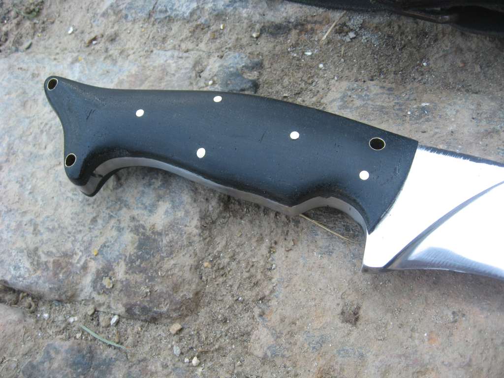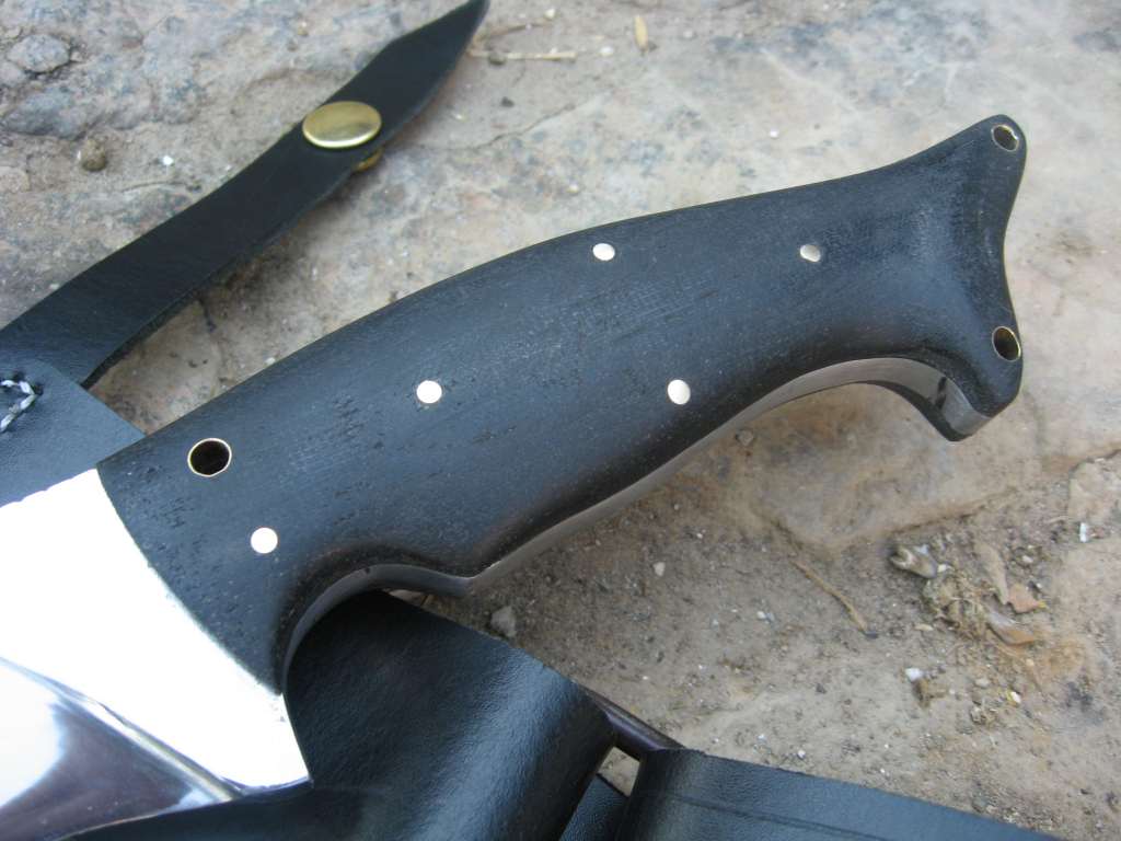 Full tang, crna micarta i mesingani pinsi i mesingane cjevcice.