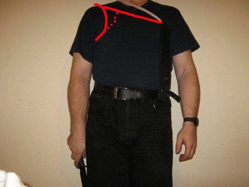 ideja nije loša samo bi ja napravio zavoj u osmicu i kad ga stavljaš na ramena onda ti preklop dođe na leđima, i dalje ti drži nož a neće ti se povlaćiti do vrata niti te stiskati(ako kužiš što hoću reći?)