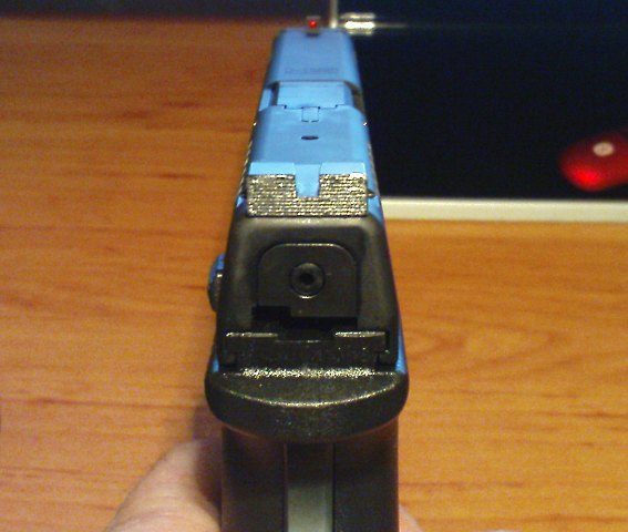 Prednji ciljnik na Glocku je plastični sa utorom koji nasjeda na navlaku, a osigurava se tankim i plastičnim štiftom koji se za svaki slučaj i zalijepi.