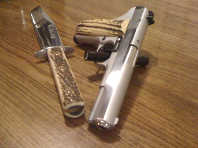 Noz sam kupio u SAD-u kod Fitzen-a (ima ga dosta na youtube-u,lud ko šlapa al ljudina..)ali je imao orahove plocice koje sam zamijenio rogom,od tog sam dobio ideju da bi mu tt mogao biti par sa plocicama rukohvata od istog roga..Kćerka mi je rekla da sam dijete veće od nje haha..kad uhvatim vremena budem stavio jos par slicica,pozz!